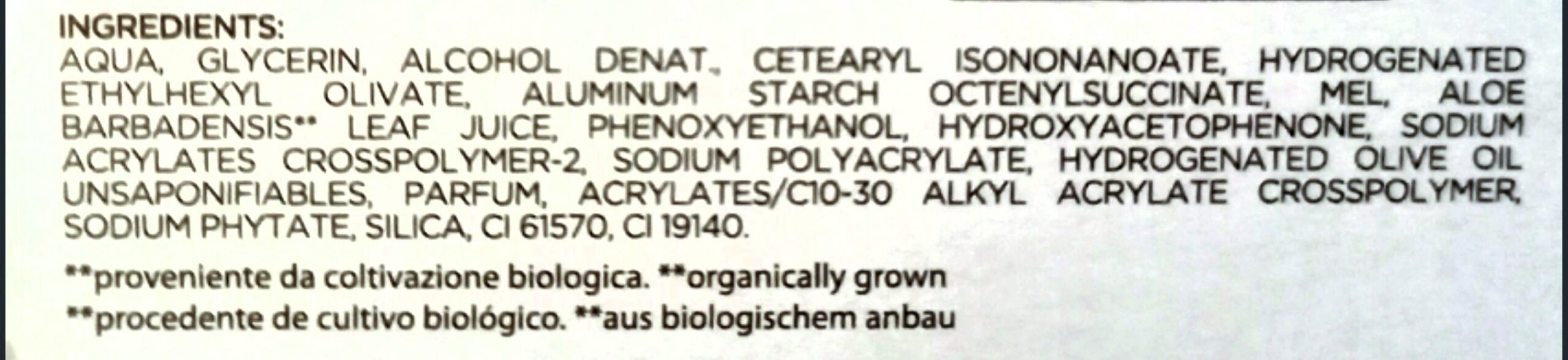 Aqua, glycerin, alcohol denat., cetearyl isononanoate, hydrogenated ethylhexyl olivate, aluminum starch octenylsuccinate, mel, aloe barbadensis* leaf juice, phenoxyethanol, hydroxyacetophenone, sodium acrylates crosspolymer-2, sodium polyacrylate, hydrogenated olive oil unsaponifiables, parfum, acrylates/c10-30 alkyl acrylate crosspolymer, sodium phytate, silica, ci 61570, ci 19140.